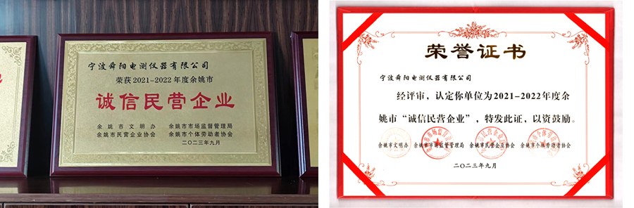 日前,我司從余姚市市場(chǎng)監(jiān)督管理局陽明所、市民協(xié)陽明分會(huì)捧來2021-2022年度余姚市“誠(chéng)信民營(yíng)企業(yè)”銅匾和榮譽(yù)證書。